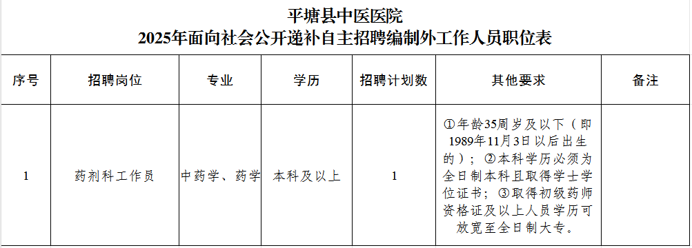 (一)平塘县中医医院2025年面向社会公开递补自主招聘编制外工作人员职位表